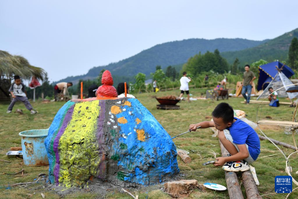 8月19日,小朋友在大元社草坪剧场的陶土装置上绘画。