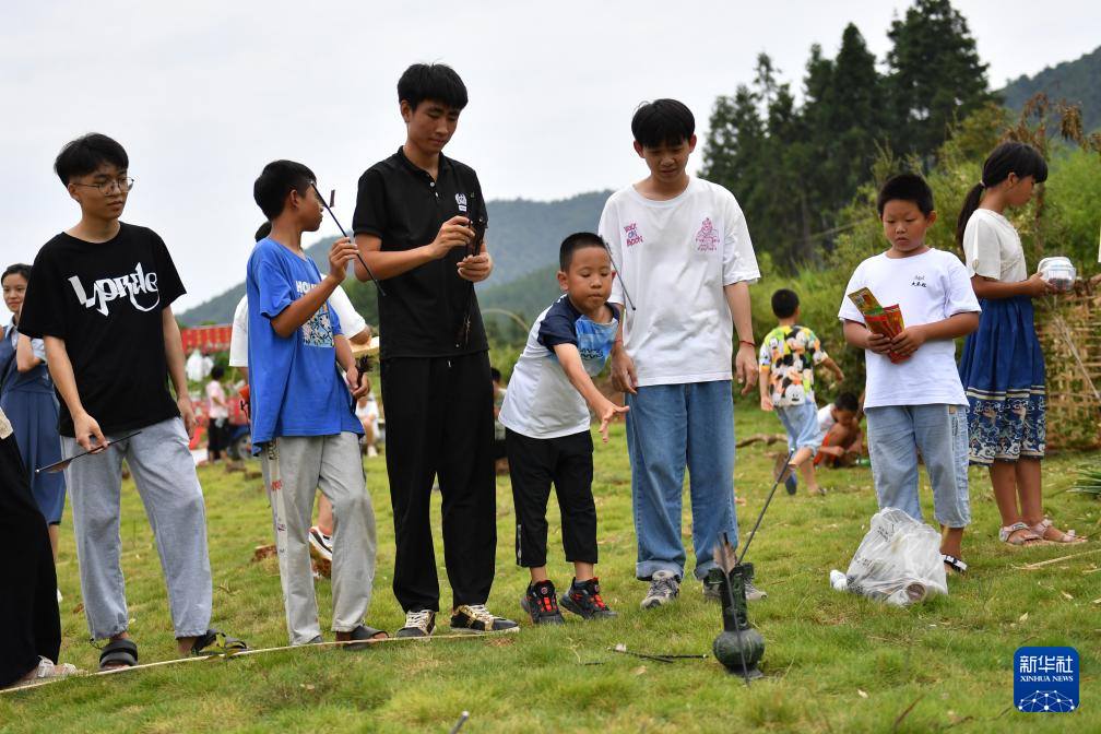 8月20日,孩子们在2023大元社乡村青少年艺术节中体验投壶游戏。