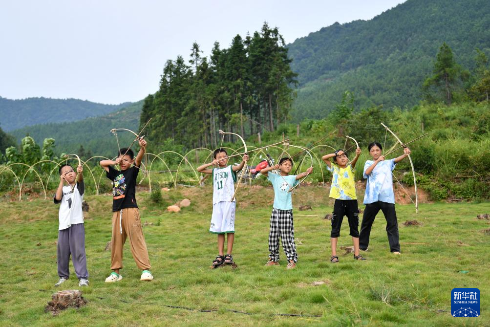 8月19日,孩子们在玩耍自己制作的玩具弓箭。