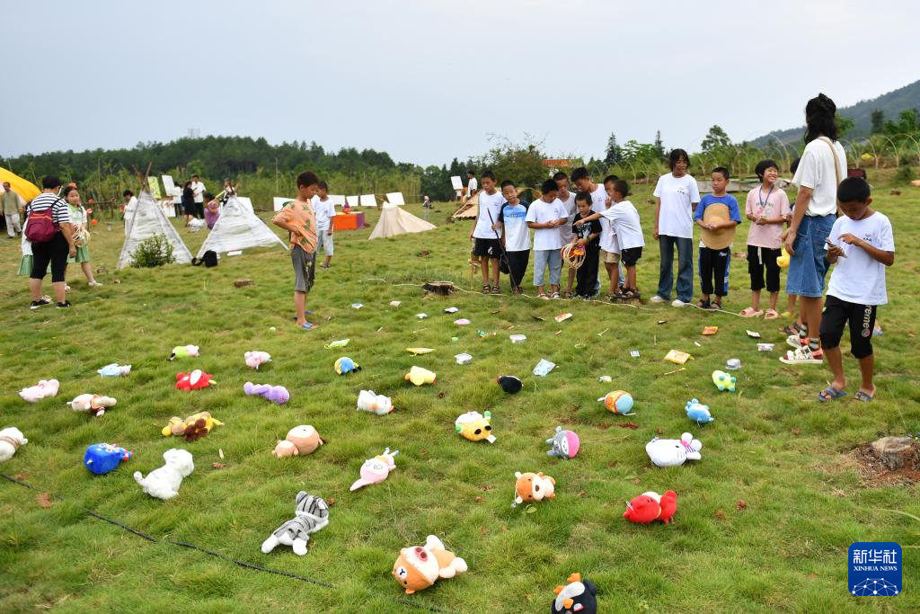 8月20日,孩子们在2023大元社乡村青少年艺术节中玩套圈游戏。