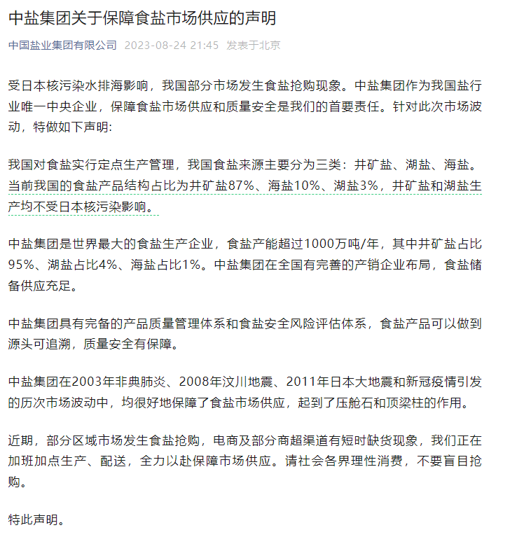受日本核污染水排海影响,我国部分市场发生食盐抢购现象。中盐集团作为我国盐行业唯一中央企业,保障食盐市场供应和质量安全是我们的首要责任。针对此次市场波动,特做如下声明: