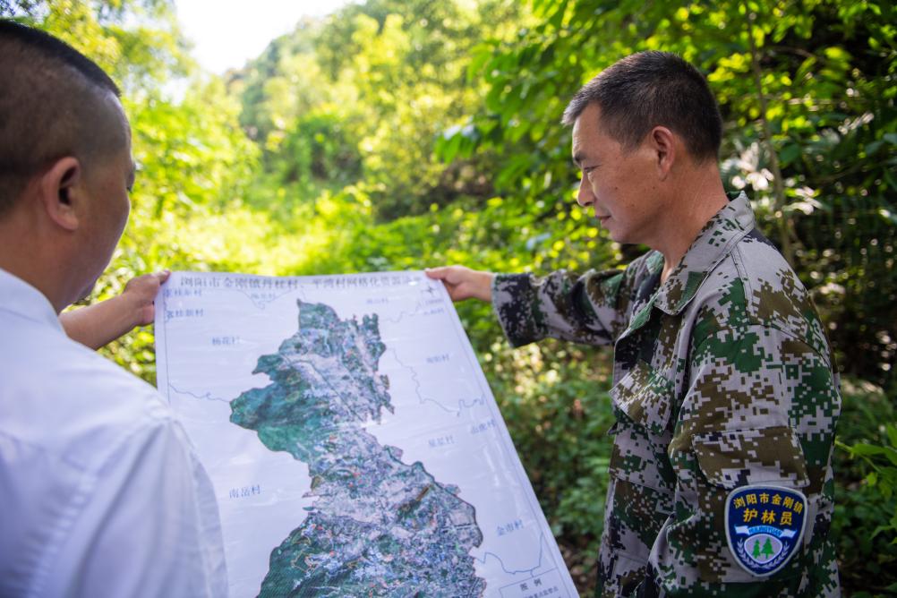 8月24日,在浏阳市金刚镇平湾村,黄蔚谷(右)和村级林长对照地图确定古树位置。