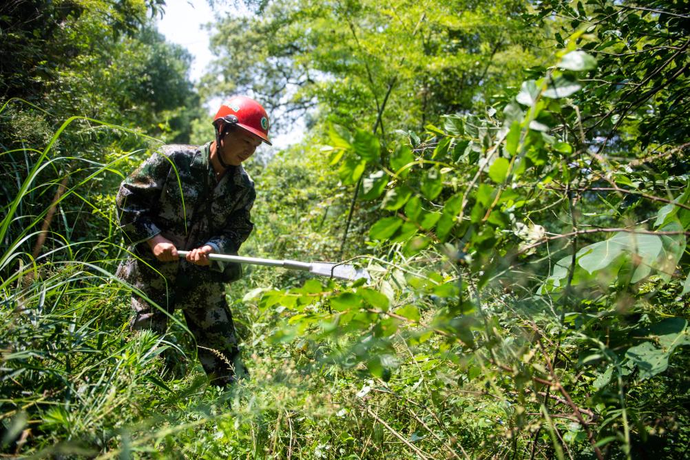 8月24日,在浏阳市金刚镇平湾村,黄蔚谷清理巡山路上的杂草。