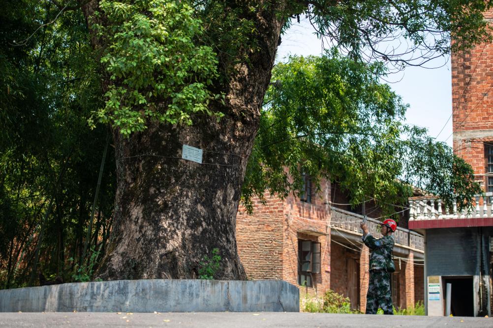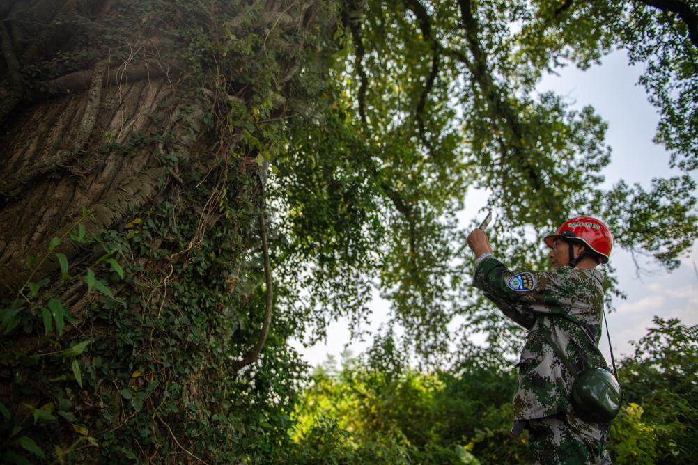 8月24日,在浏阳市金刚镇平湾村,黄蔚谷观测古树生长情况。