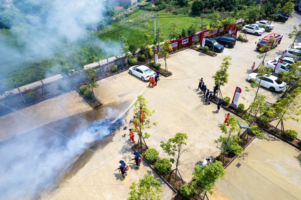 8月25日,在浏阳市金刚镇政府院内,护林员和森林消防队员进行消防演练(无人机照片)。
