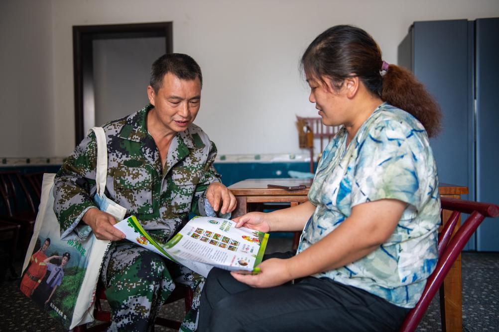 8月24日,在浏阳市金刚镇平湾村,黄蔚谷(左)向村民宣传森林防火和古树保护相关知识。