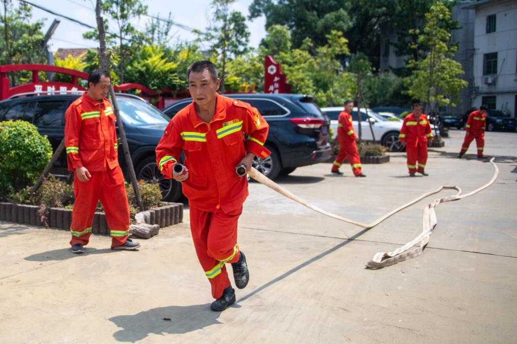8月25日,在浏阳市金刚镇政府院内,黄蔚谷(左二)和同事们进行消防演练。