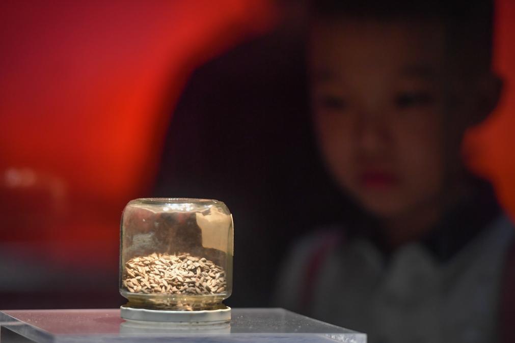 8月26日,在长沙市芙蓉区的隆平水稻博物馆,小朋友在参观马王堆1号汉墓出土的稻谷。