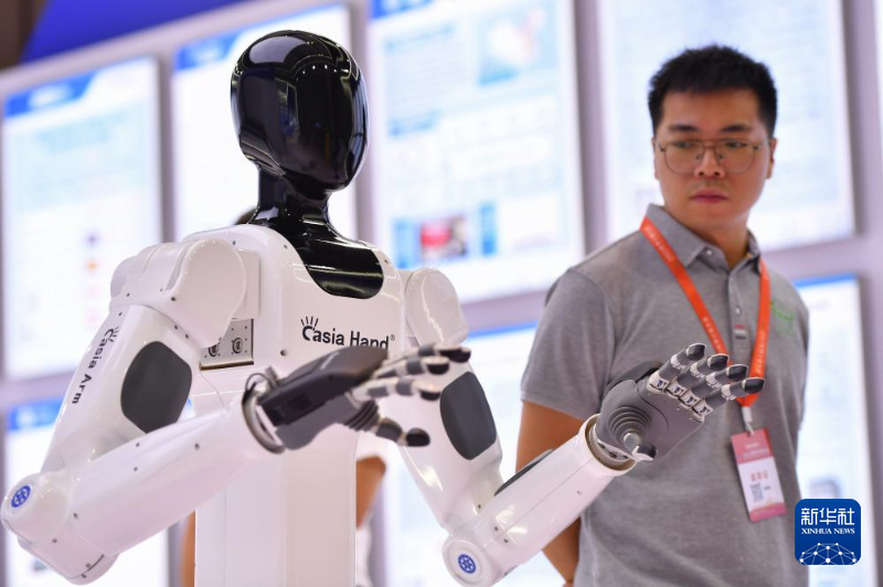 参观者在2023世界计算大会成果展示区参观服务机器人。新华社记者陈泽国 摄