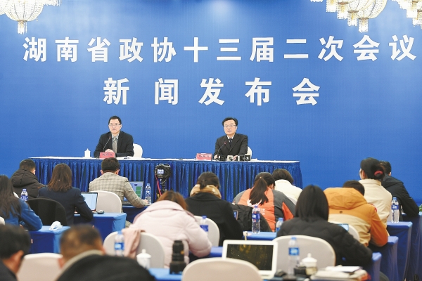 1月22日上午,省政协十三届二次会议举行新闻发布会。省政协副秘书长、省政协十三届二次会议新闻发言人杨湘川(右)发布新闻。湖南日报全媒体记者 徐行 田超 摄影报道