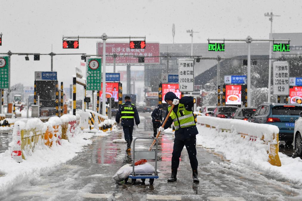 1月22日,工作人员在长张高速长沙西收费站抛撒融雪剂。新华社记者 陈振海 摄