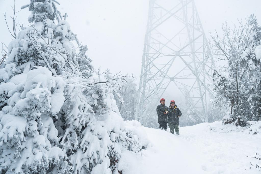 1月22日,国网长沙供电公司输电检修人员在浏阳市蕉溪镇蕉溪岭巡查电力设施覆冰情况。新华社记者 陈思汗 摄