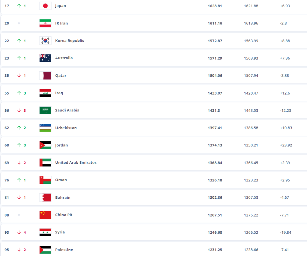亚洲前三为日本队、伊朗队、韩国队