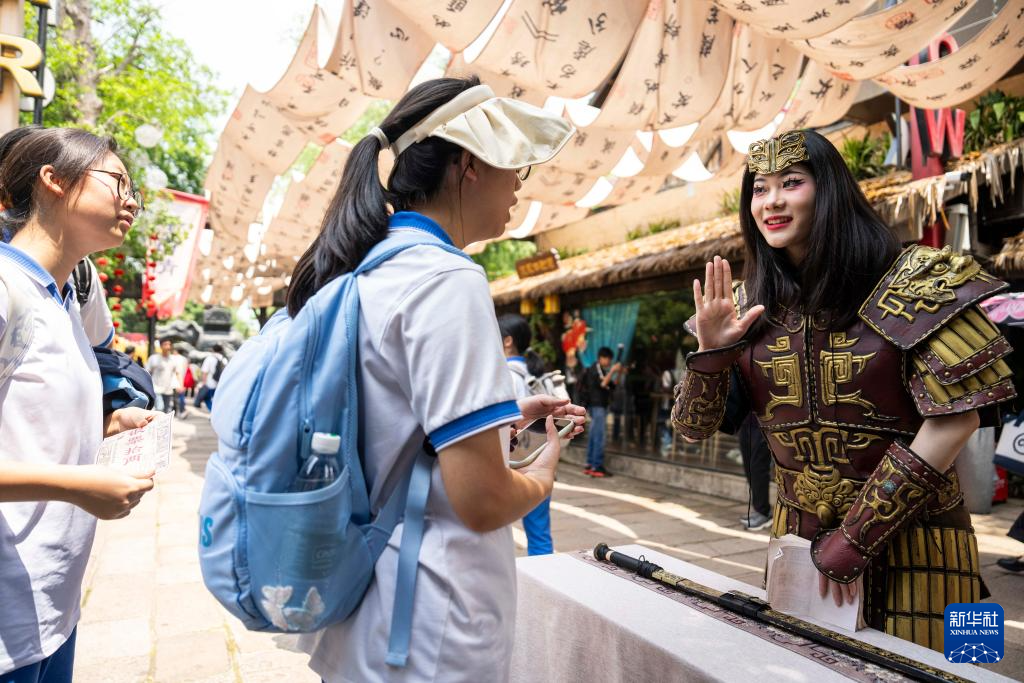 4月28日,在宁乡市炭河古城景区,参与活动的学生(右一)与游客互动。新华社记者 陈思汗 摄pagebreak