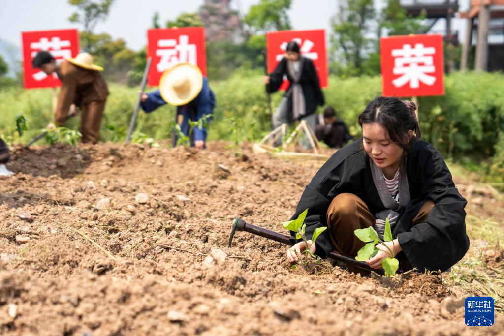 4月28日,在宁乡市炭河古城景区,学生在进行农耕实践。新华社记者 陈思汗 摄