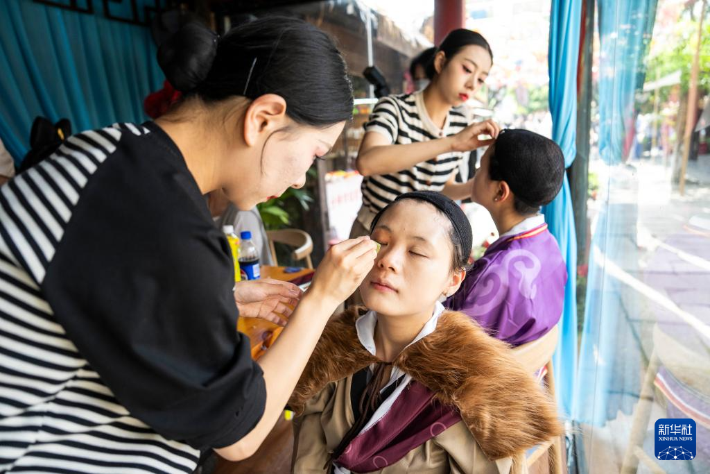4月28日,在宁乡市炭河古城景区,学生(左二)在工作前化妆。新华社记者 陈思汗 摄pagebreak