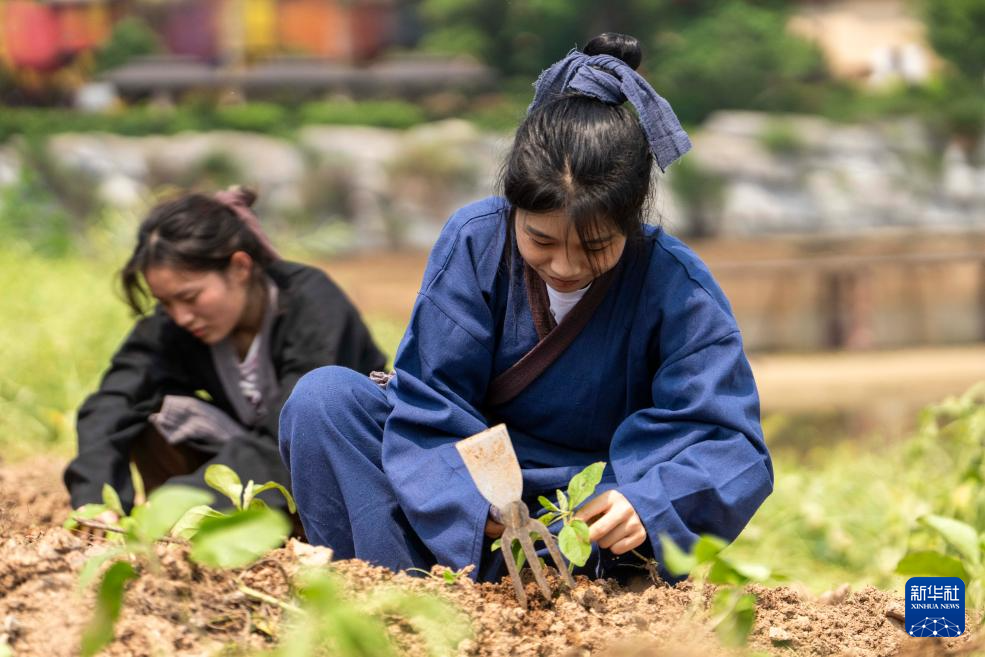 4月28日,在宁乡市炭河古城景区,学生在进行农耕实践。新华社记者 陈思汗 摄pagebreak