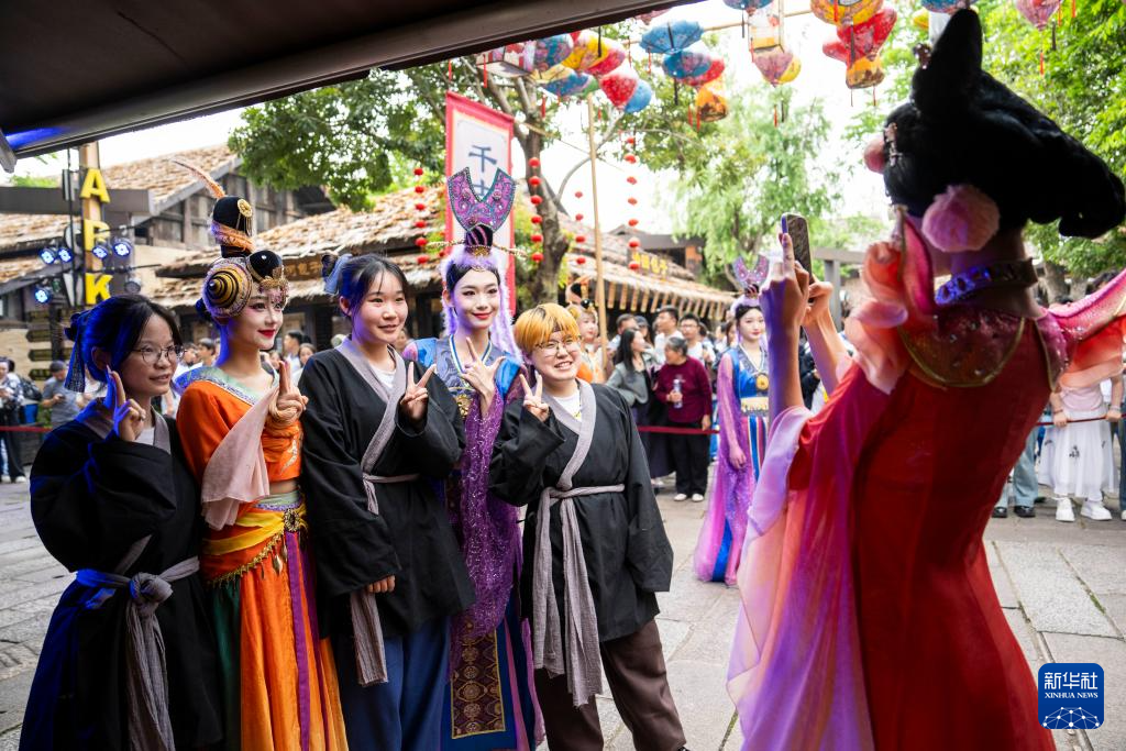 4月28日,在宁乡市炭河古城景区,学生与游客合影。新华社记者 陈思汗 摄pagebreak