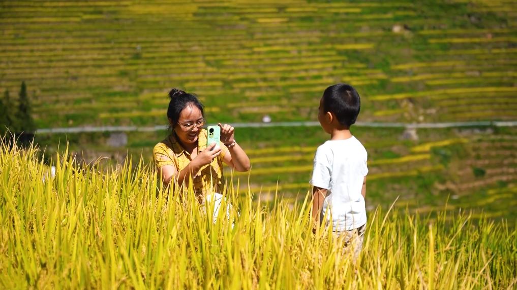 国庆中秋假期期间,游客们来到这里,打卡壮观的梯田美景,感受千年农耕文化。