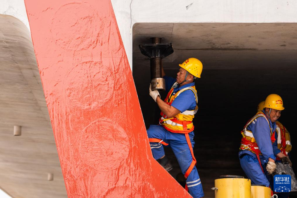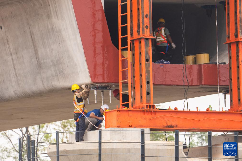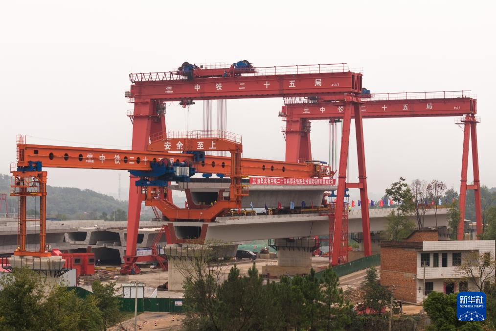 10月13日,中铁二十五局工人在邵永高铁跨芦洪江特大桥架梁施工现场作业。新华社记者 陈思汗 摄