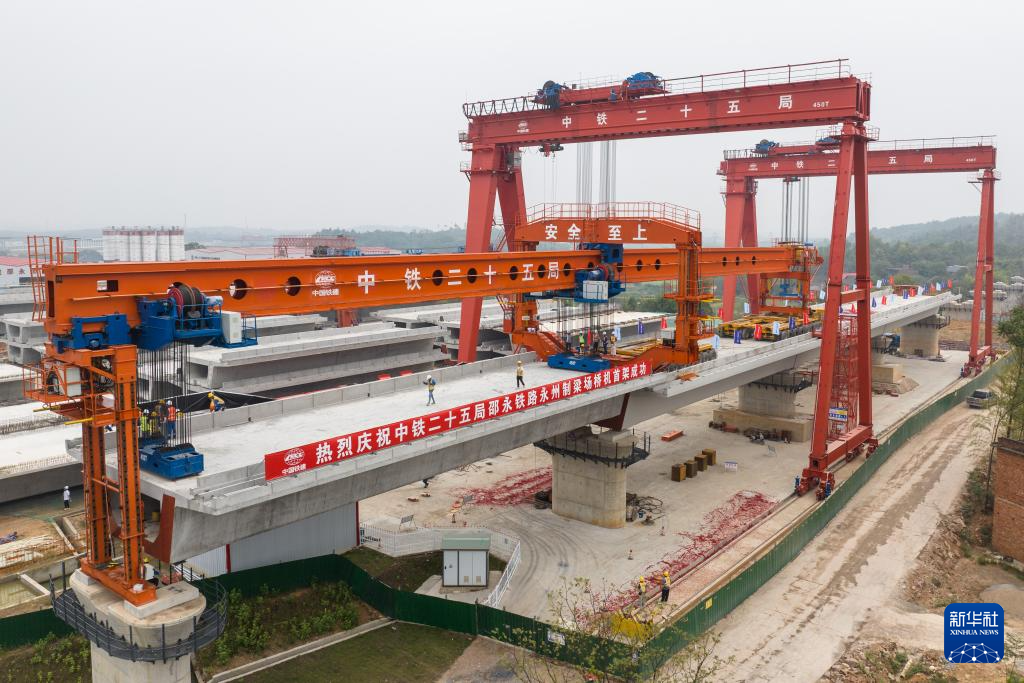 10月13日,在位于湖南省永州市的邵(阳)永(州)高铁跨芦洪江特大桥施工现场,一榀长32.6米、重近817吨的箱梁平稳架设,标志着由中铁二十五局承建的邵永高铁三标正式开始架梁,该条新建铁路进入了架梁施工高峰阶段。