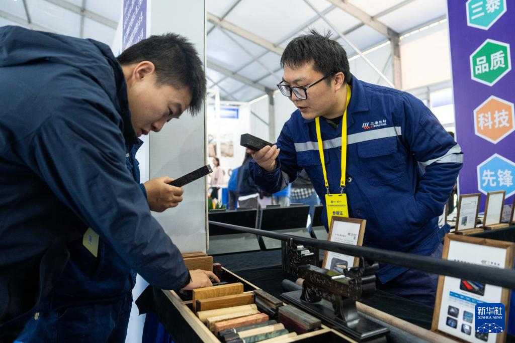 11月27日,在娄底经开区电力科技谷,参展商(右)在介绍木基复合材料。新华社记者 陈思汗 摄