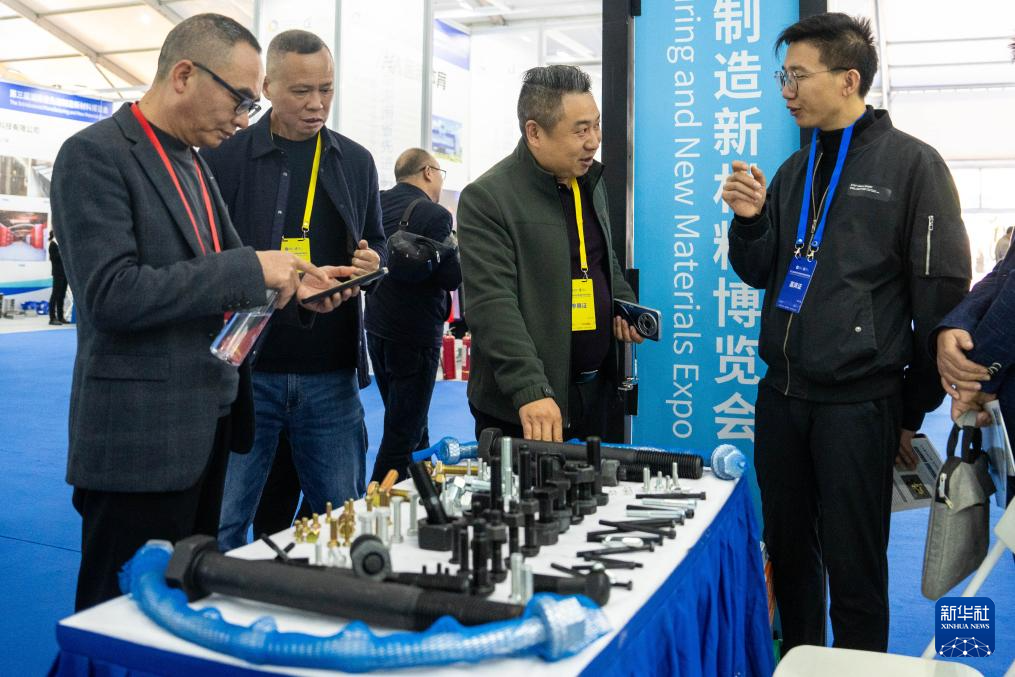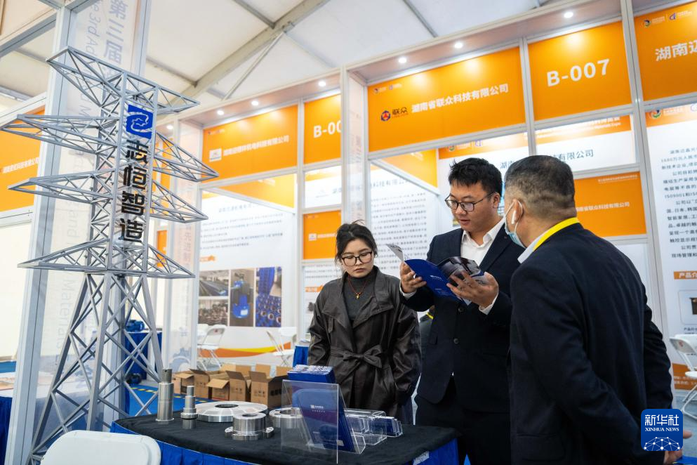 11月27日,在娄底经开区电力科技谷,参观者(右一)在了解高强度紧固件产品。新华社记者 陈思汗 摄pagebreak