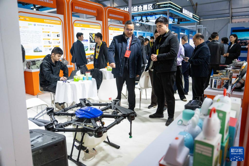 11月27日,在娄底经开区电力科技谷,参观者(中)在了解一款农用无人机。新华社记者 陈思汗 摄pagebreak