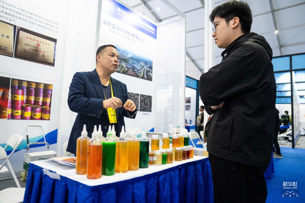 11月27日,在娄底经开区电力科技谷,参展商(左)在介绍金属切削液。新华社记者 陈思汗 摄pagebreak