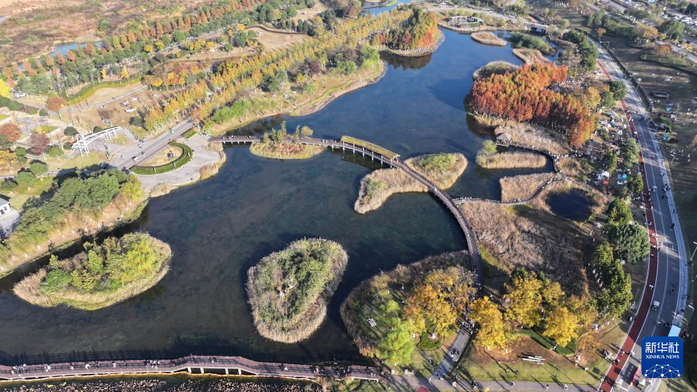 11月30日,市民在松雅湖国家湿地公园内游玩(无人机照片)。新华社记者 陈振海 摄