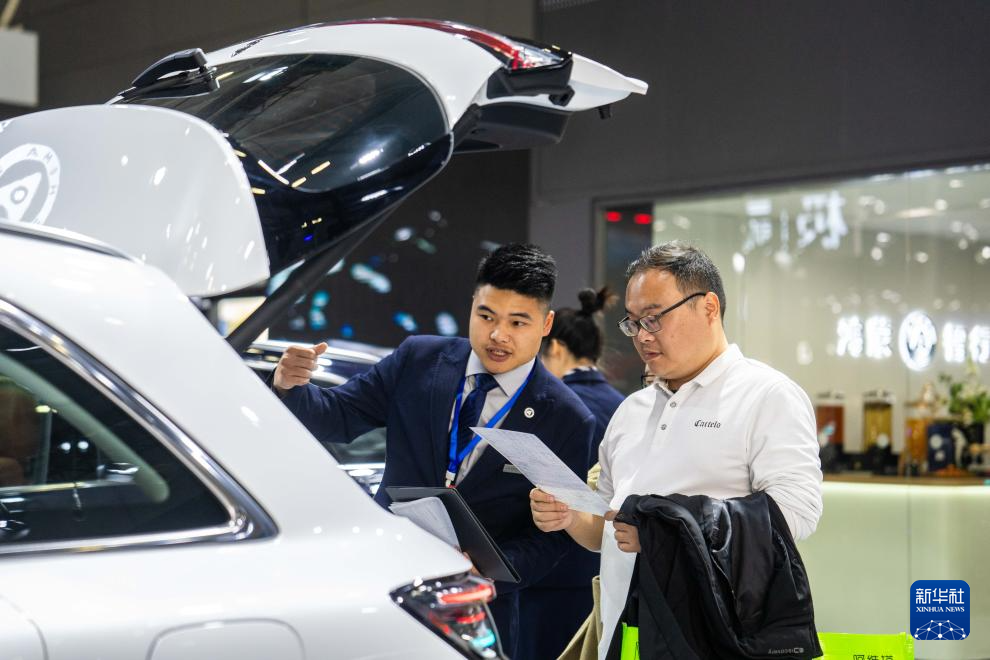 12月10日,在长沙国际会展中心,工作人员(左)在介绍参展车辆。新华社记者 陈思汗 摄pagebreak