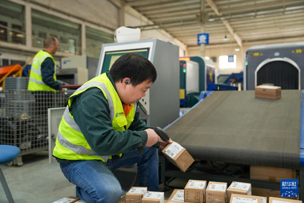 12月10日,工作人员在长沙国际邮件互换局为进口包裹贴上清关完成的标签。新华社记者 薛宇舸 摄pagebreak