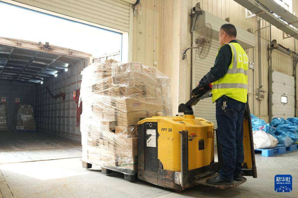12月10日,工作人员在长沙国际邮件互换局将出口包裹装车。新华社记者 薛宇舸 摄