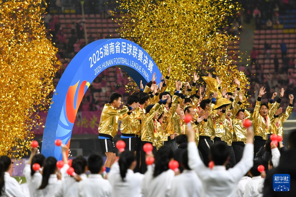 当日,在湖南长沙贺龙体育场举行的2025湖南省足球联赛(“湘超”)决赛中,永州队1比0战胜常德队,夺得冠军。