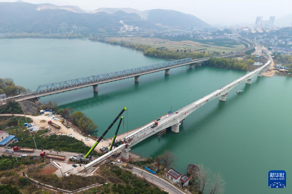 12月29日,在位于常德市石门县的陕煤铁路专用线澧水特大桥施工现场,中铁四局工人在进行架梁作业(无人机照片)。新华社记者 陈思汗 摄