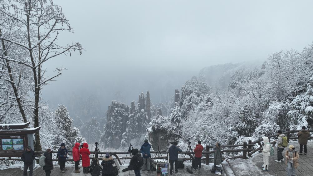 假期里,张家界武陵源风景名胜区迎来降雪,云海、雾凇、峰林相映成趣。这份“冬日限定”的景色,吸引众多游客专程到张家界观雪,各大景区内快门声与欢呼声不绝于耳。