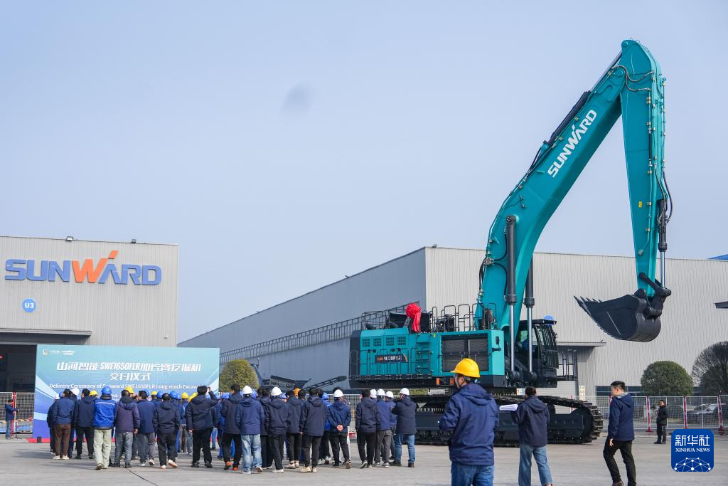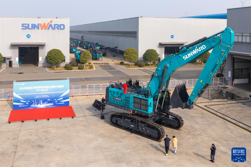 这是1月6日在长沙山河工业城拍摄的山河智能SWE1650FLR加长臂挖掘机。新华社记者 陈思汗 摄