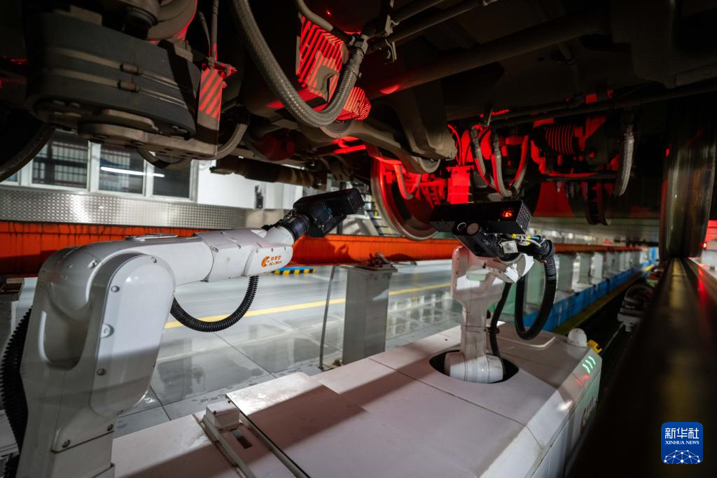 2月2日凌晨,在长沙动车运用所,动车组车底检测机器人在检查动车组车底情况。新华社记者 陈思汗 摄pagebreak
