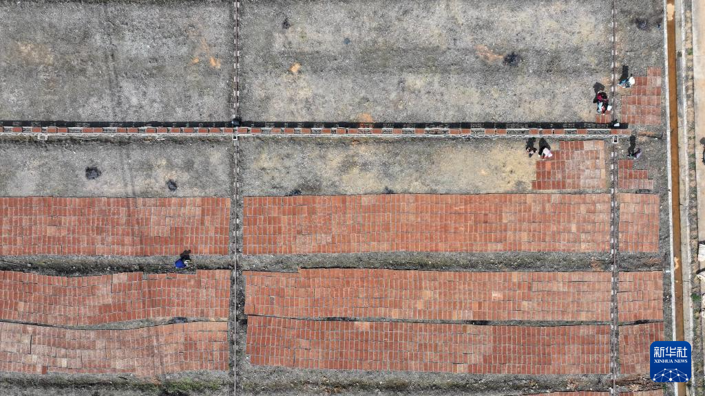 3月12日,在岳阳市岳阳县筻口镇丰瑞农机专业合作社,农民在田间摆放早稻秧盘(无人机照片)。新华社记者 陈振海 摄