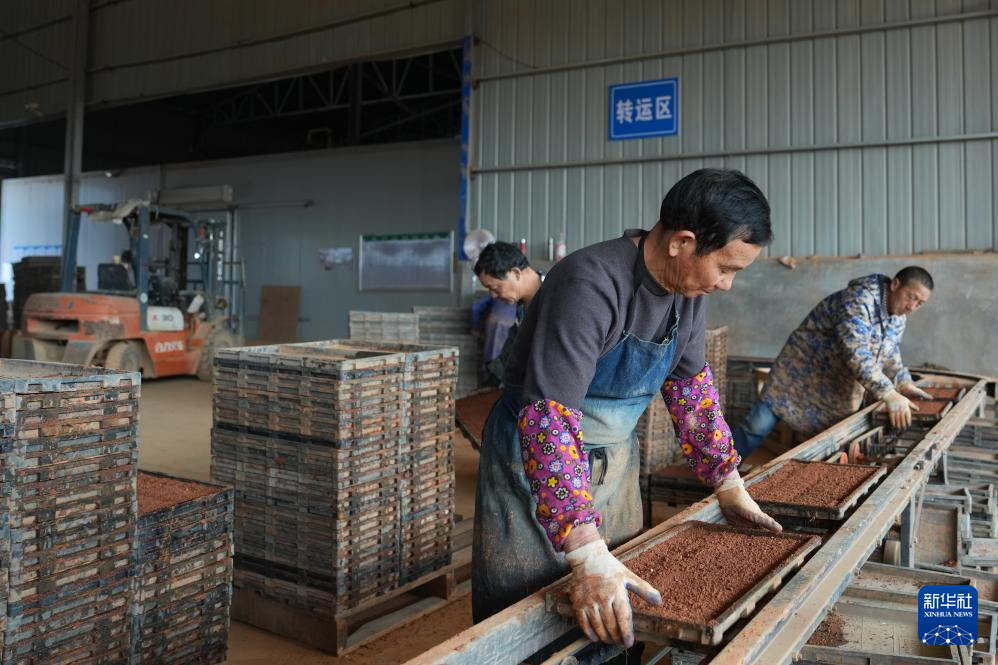 3月12日,在岳阳市岳阳县筻口镇丰瑞农机专业合作社,农民在搬运早稻秧盘。新华社记者 陈振海 摄pagebreak
